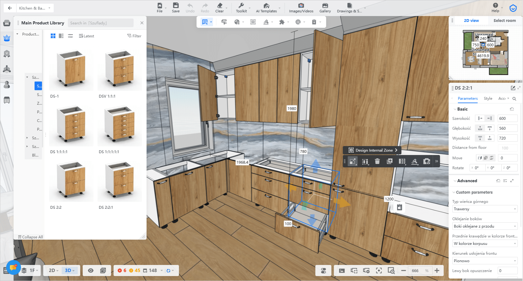 Tak, program Coohom zawiera bibliotekę mebli parametrycznych w polskim standardzie, a także bibliotekę okuć i materiałów technicznych od popularnych marek. Dzięki temu projektujesz szybciej i zgodnie z lokalnymi normami.